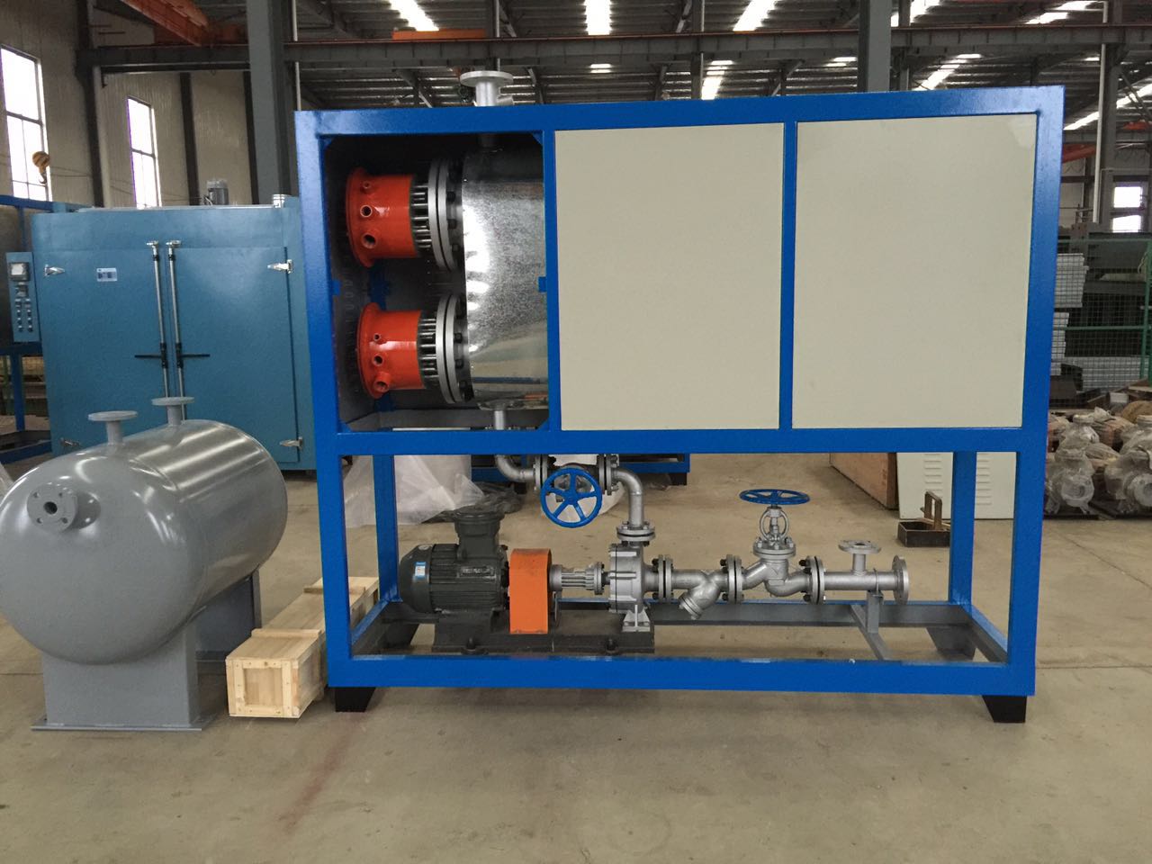 導熱油爐排氣流程: 1、導熱油通過膨脹槽注油口處加注,并通過膨脹口管道流入設備及油爐本體內,此時注油時一定要打開系統(tǒng)中所有的閥門(放油閥除外),讓導熱油流入筒體及需加熱設備內。 2、當液面顯示約為膨脹槽高度1/2時,停止注油。 3、首 行常溫排氣:接通電源,打開導熱油加熱器的進出口閥門及排氣閥(膨脹管道閥門需一直開著以及時補充油量),按動油泵啟動按鈕,油泵運行,油泵應按箭頭指示方向正常運行,壓力表壓力顯示在規(guī)定范圍內,視聽油泵運行情況,如有異常現(xiàn)象應立即停機檢查,將故障排除后再重新起動油泵,進行常溫下排氣,直至壓力表指示穩(wěn)定。進行常溫排氣時,要注意觀察膨脹槽內的液位,當?shù)陀谝?guī)定的液位高度時要及時進行補充。 4、升溫脫水:在確認常溫下運行正常后,即可進行升溫脫水排氣(操作前詳閱導熱油使用說明書及溫控儀使用說明書),升溫脫水排氣可按如下步驟進行: 步:升溫至100-120℃保溫 開始升溫時,應該控制升溫速度在50℃/h以內,并且監(jiān)視壓力表顯示是否正常,如發(fā)現(xiàn)無壓力或壓力不穩(wěn),說明系統(tǒng)內仍有殘留氣體,此時要求按3要求重復進行常溫排氣操作,待系統(tǒng)壓力穩(wěn)定后方可繼續(xù),升溫至120℃后進行長時間保溫,保溫時間的長短與系統(tǒng)總容量及導熱油的質量有關。  第二步:升溫至150-180℃保溫。  排除油中輕組分、揮發(fā)物及殘余水分,請參照KRD系列導熱油加熱器系統(tǒng)脫水排氣曲線圖操作 第三步:脫水排氣完成后要關閉排氣閥(其它閥門無需關閉),投入正常升溫運行。 5、 升溫脫水排氣過程有關事項。 升溫過程中管路可能會發(fā)出碰擊的響聲,說明系統(tǒng)內有大量氣體或管道不暢,此時要降低升溫速度,待氣體排除便可消除聲響;如系管道不暢所至應予以排除。 脫水排氣過程可能會有大量氣體涌入膨脹槽,造成槽內導熱油外溢,操作前要在溢油管下安置好溢油容器。 進行脫水排氣時,現(xiàn)場必須有人員看守,發(fā)現(xiàn)異常及時處理。   對于所提的油泵無油或少許油流出的問題,解決方案如下: 1、 關閉出油口閥門,啟動油泵,觀察壓力表顯示情況,若無壓力,則說明回油口無油補充油泵,使得油泵空轉,無后續(xù)油及時補充,則請貴司檢查一下回油口的供油情況,此時請確保膨脹槽里有油并膨脹管道閥門打開和需熱設備有油并出油口閥門在打開狀態(tài)。 2、 如果以上要求都執(zhí)行到位,壓力表還無壓力,請檢查油爐上的油泵、截止閥及過濾器是否堵塞。 3、 若壓力表顯示壓力值,而油泵、截止閥及過濾器并無堵塞,那油爐的出油口一定會按油泵所提供的流量進行流出。